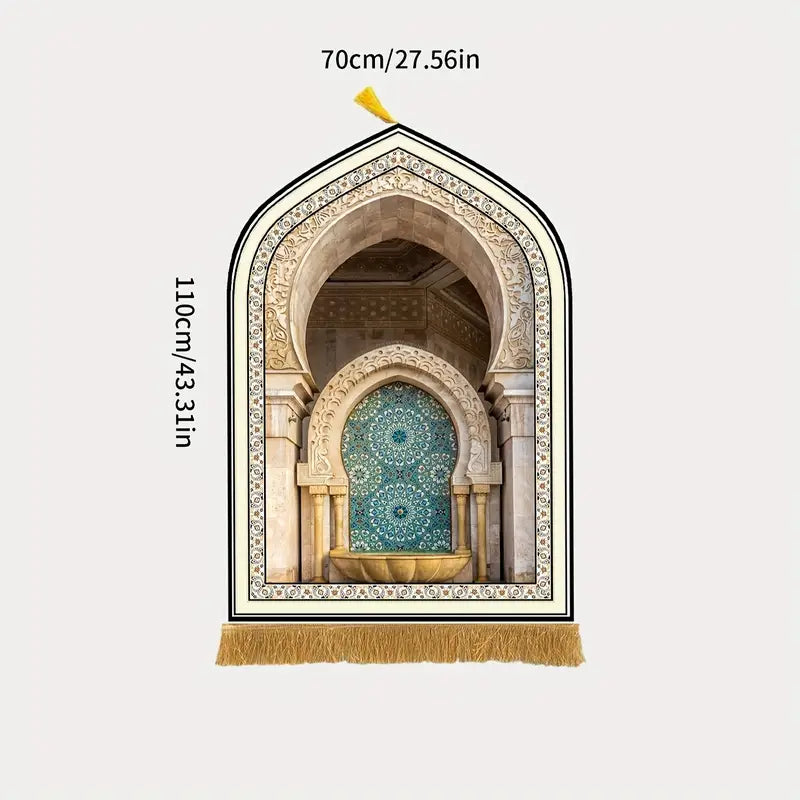 100% Polyester Machine-Washable Indoor Prayer Mat for Home Decor, Blue & Beige Traditional Muslim Prayer Mat, Spiritual Decor Item | Arch Pattern Mat | Machinewashable Mat, Islamic Wall Art .Enhance your spiritual moments with this beautifully crafted prayer mat, featuring an intricate Moroccan archway and tile design. Inspired by the elegance of Islamic architecture, the centerpiece showcases a stunning mosaic in turquoise and blue tones, framed by sculpted stone columns and a decorative arch. The mat's overall design brings a serene and sacred ambiance to your prayer space.